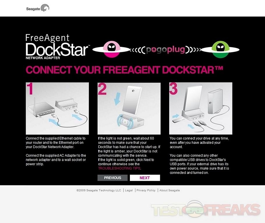 Set up is quick and easy process and involves powering up the Dockstar, connecting it to an available Ethernet line (usually off one’s router) and docking a Seagate FreeAgent Go portable hard drive or another USB drive to the device. After a few seconds the LED light in the front of the dock will turn green; this means that the dock is connected to the web.