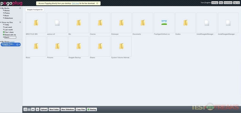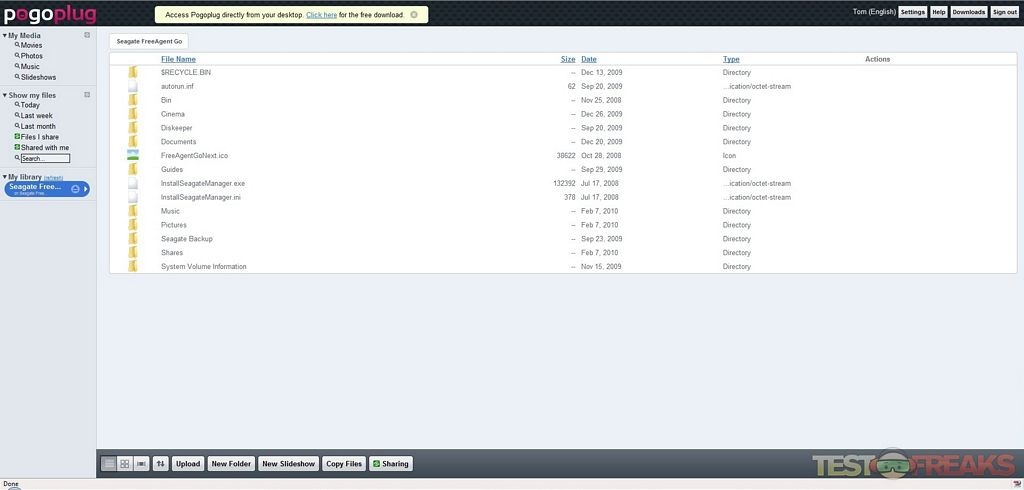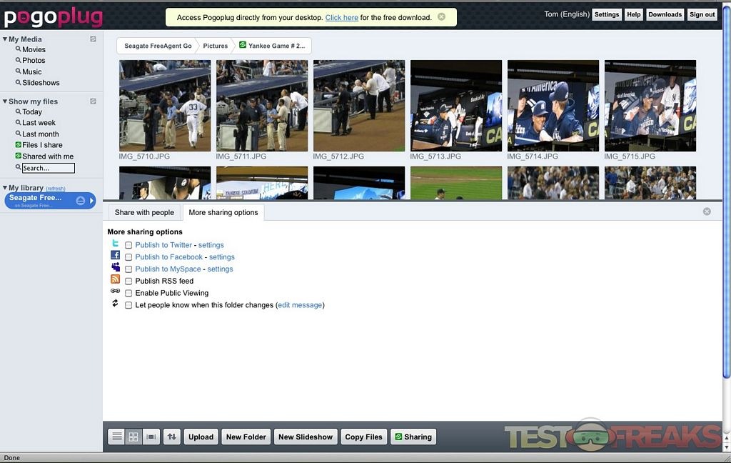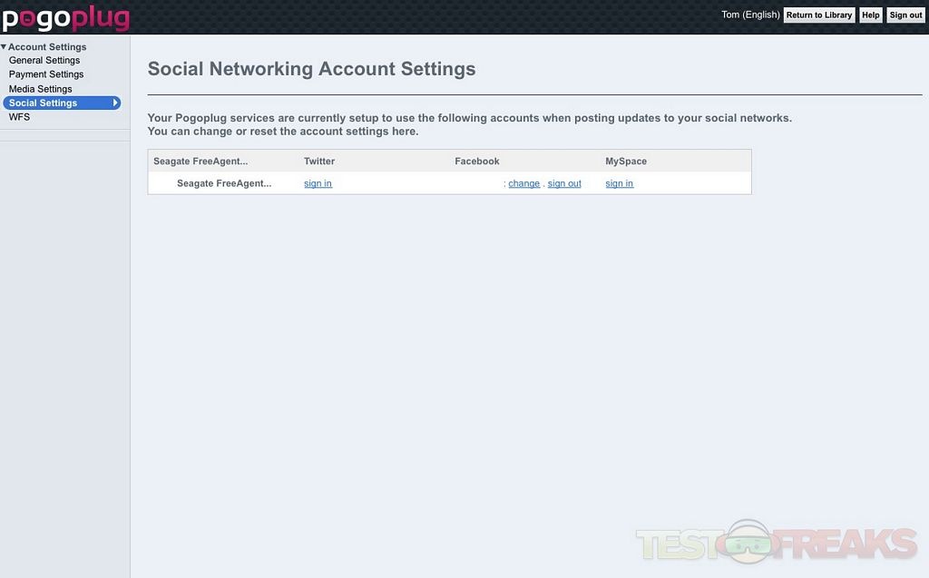 Sharing files involves selecting a folder to share and then emailing the person you wish to provide access to. You can allow read only or read/write access to this person. Not to be left out of the social networking party, Seagate implemented Facebook, Twitter and MySpace sharing. This is done through the settings menu and once enabled shared folders will appear on your profile page and will change with update to the folder; a really simple way of posting photos for family and friends.