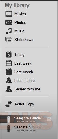 On the left side of the interface is the navigation, the first is My Library, basically your stuff. In the middle section you’ll see categories for Today, Last Week, Last Month then there’s Files I Share and Shared with Me. The next choice is Active Copy, then below that is the drives you’ve got connected, clicking on one opens it.