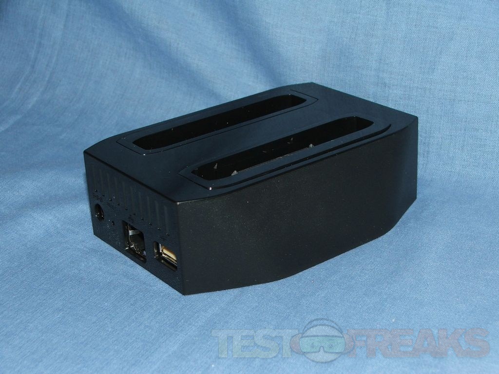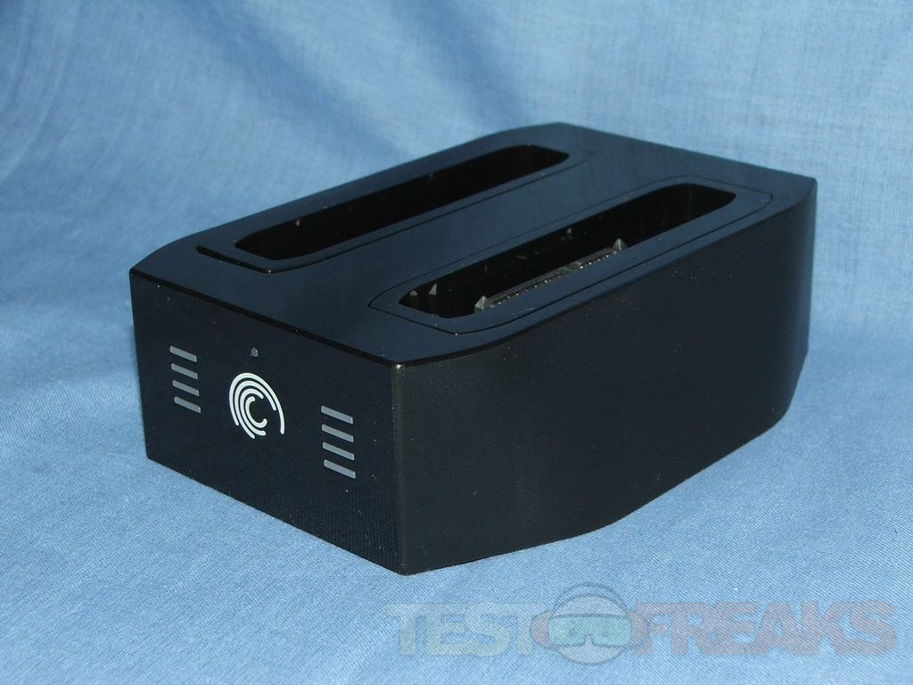 The GoFlex net itself just looks like a little block of black plastic with two holes in the top. There are inserts in the slots that comes out for different sized drives. On the front you’ll see the Seagate logo and an LED indicator above and one on each side.
