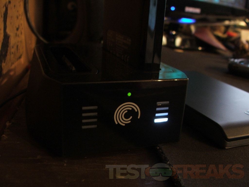 Here are two pictures of the GoFlex with the drive in it and with my Seagate BlackArmor drive attached via USB as well. You can see the white LED is lit up to indicate the drive is plugged in. The white LED bars are actually for capacity as well 1 bar is 0-25% full, 1 and 2 on is 25-50% full, 1,2 and 3 on 51-85% full and then 1-4 on would be 86-100% full. It’s not perfect, but it gives you a general idea of the capacity of the drive.