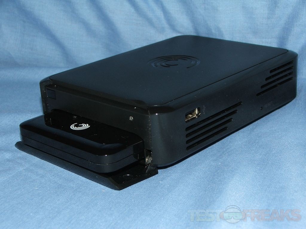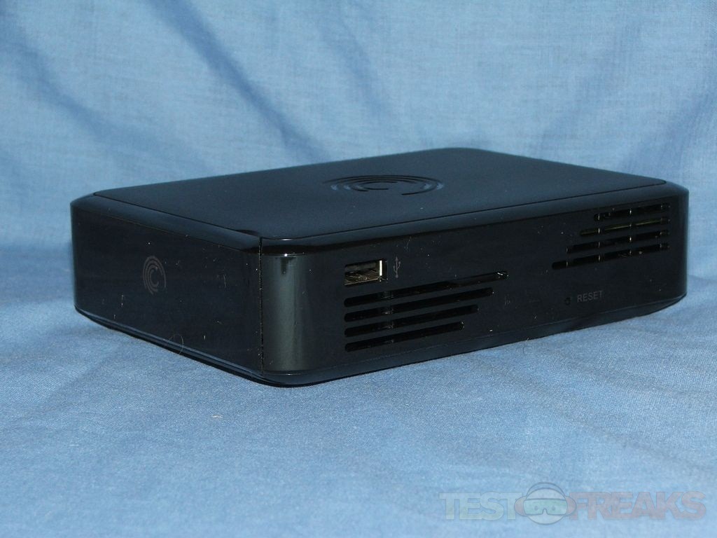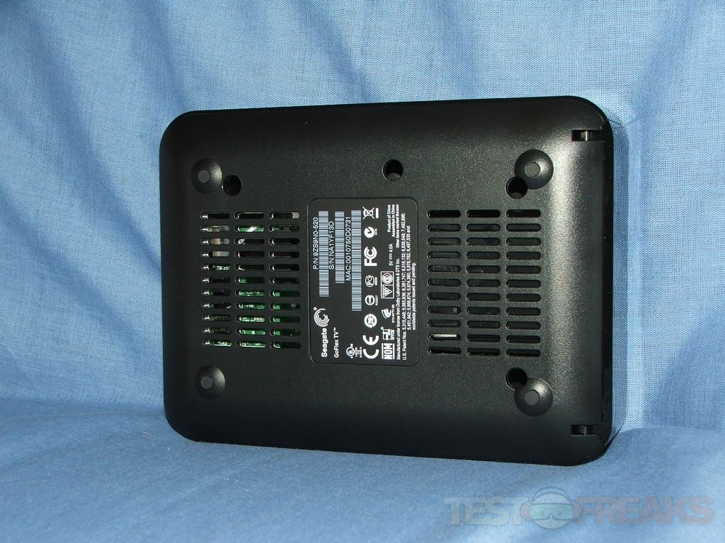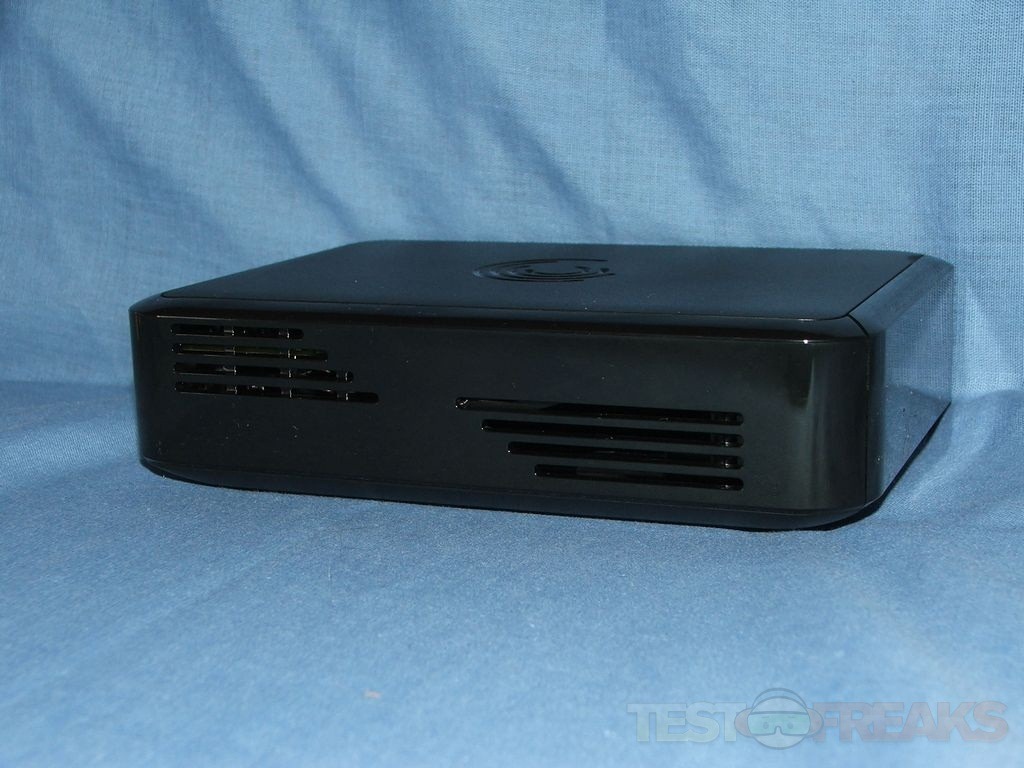The GoFlex TV looks just like a little black box, that’s probably because that’s what it is though. There’s a USB port and reset button on the right side along with cooling vents. The left side has cooling vents as well while on the bottom you’ll find vents and rubber feet.