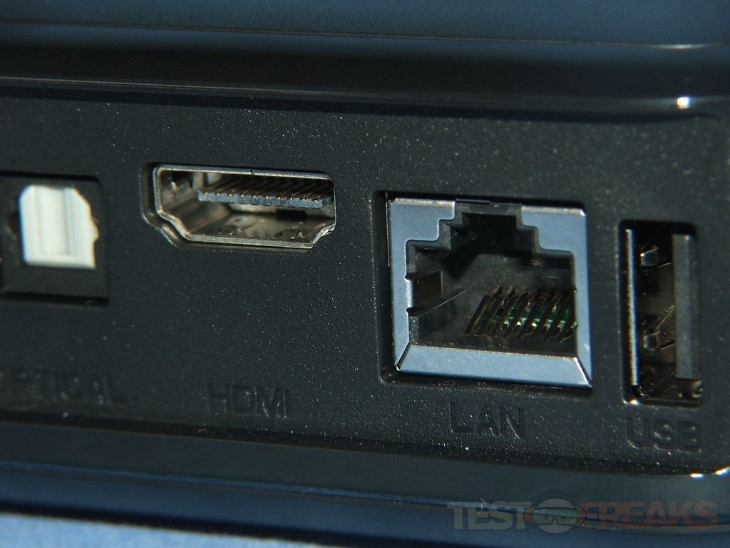 On the back is where you’ll find the connections. The component and composite video outputs are in the form of headphones jacks basically. There’s another USB port there, HDMI, Ethernet, power and optical.
