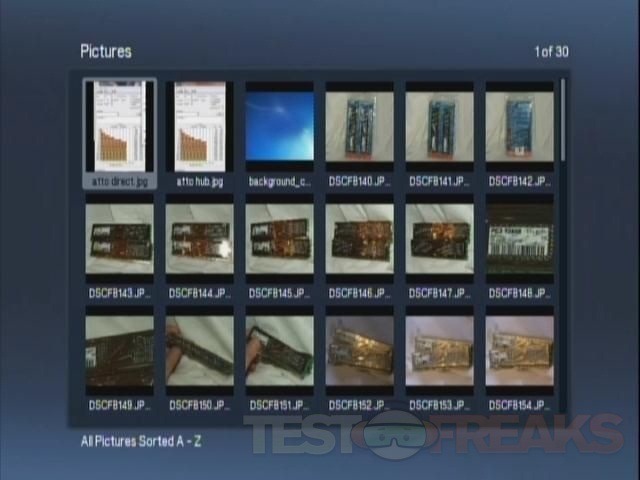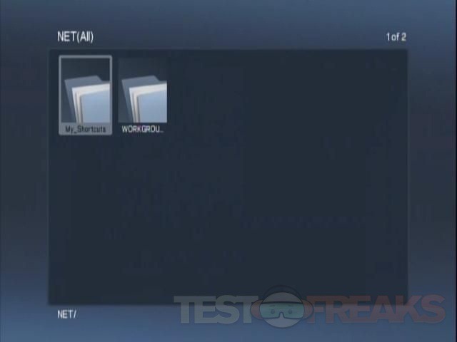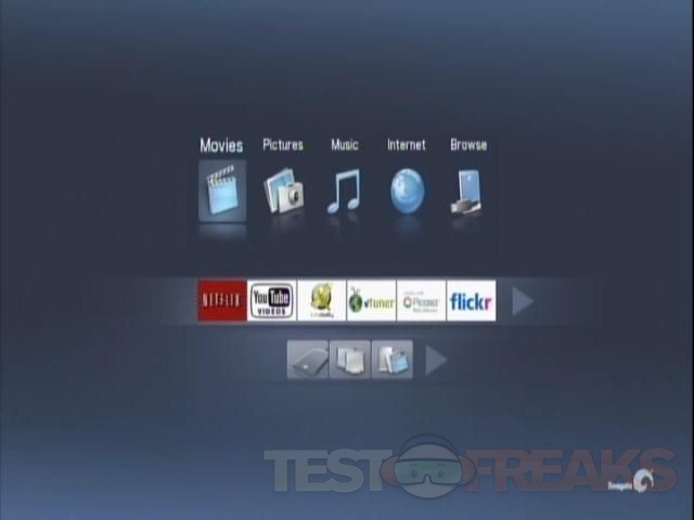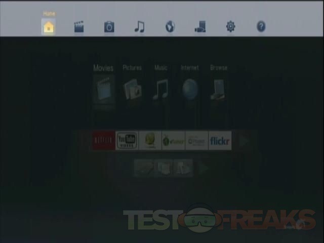 On the main interface you’ll find three bars or sets of navigation. On the top is the basic functions for Movies, Pictures, Music, Internet and Browse. In the center you’ll find what are shortcuts really, these are the same as you’ll find under the Internet option at the top. On the very bottom you’ll find three more choices for Browse the hard drive, Network and Media Servers.