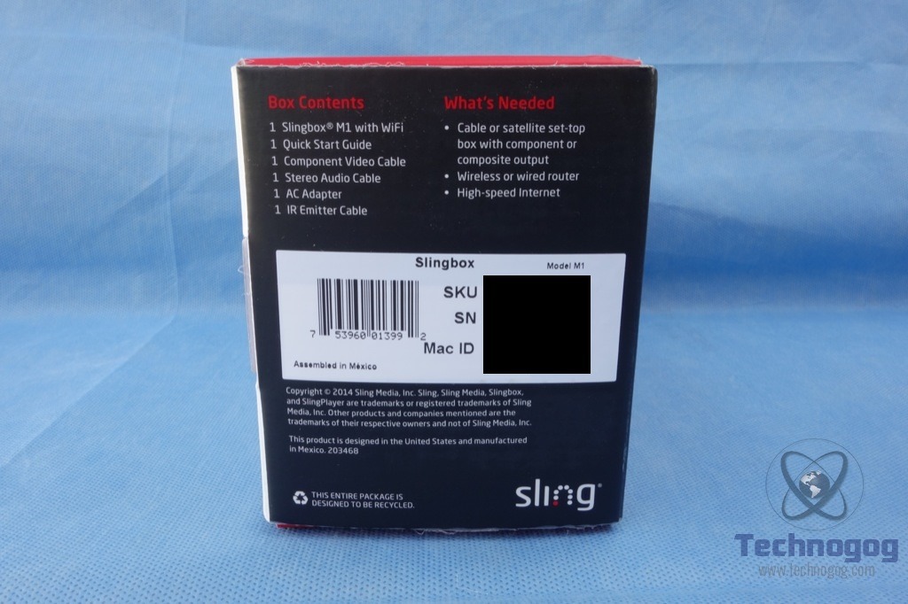 The Slingbox M1 arrive is a red and black cardboard box with the device visualized on the front with a description of its functionality. The back of the package provides a visual diagram of how the Slingbox M1 relays your TV signal remotely along with more detailed features and a compatibility listing. On the sides of the box is a listing of the contents, what is needed to get set up and the serial, MAC and SKU numbers.