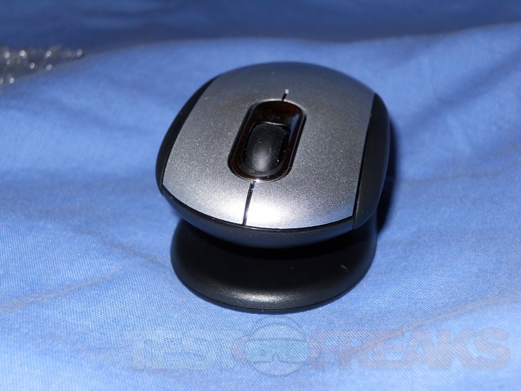 The mouse has just two buttons and a scroll wheel, it’s fairly basic. Here’s a few views of it for you, as you can see it sits up on a pedestal like base, the mouse pivots on it. The sides have a rubberized feeling to them, and the one I got is silver but it’s available in other colors as well.