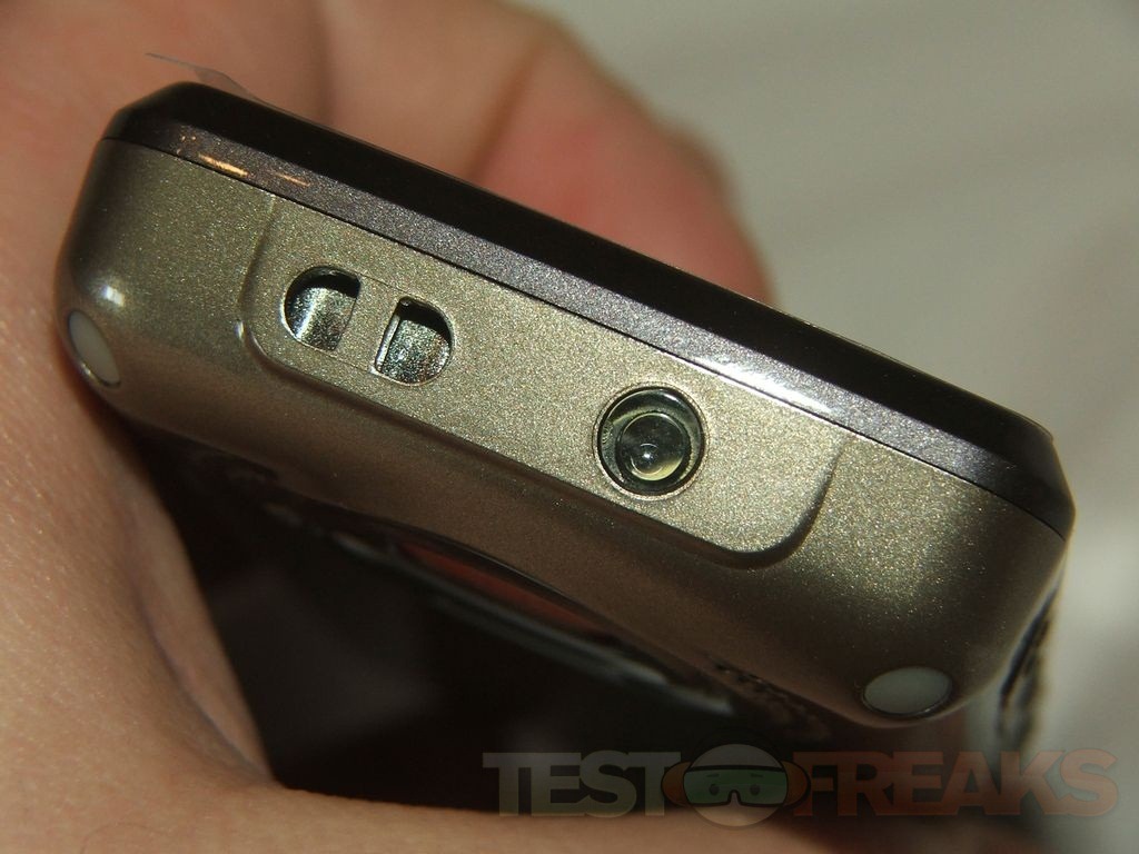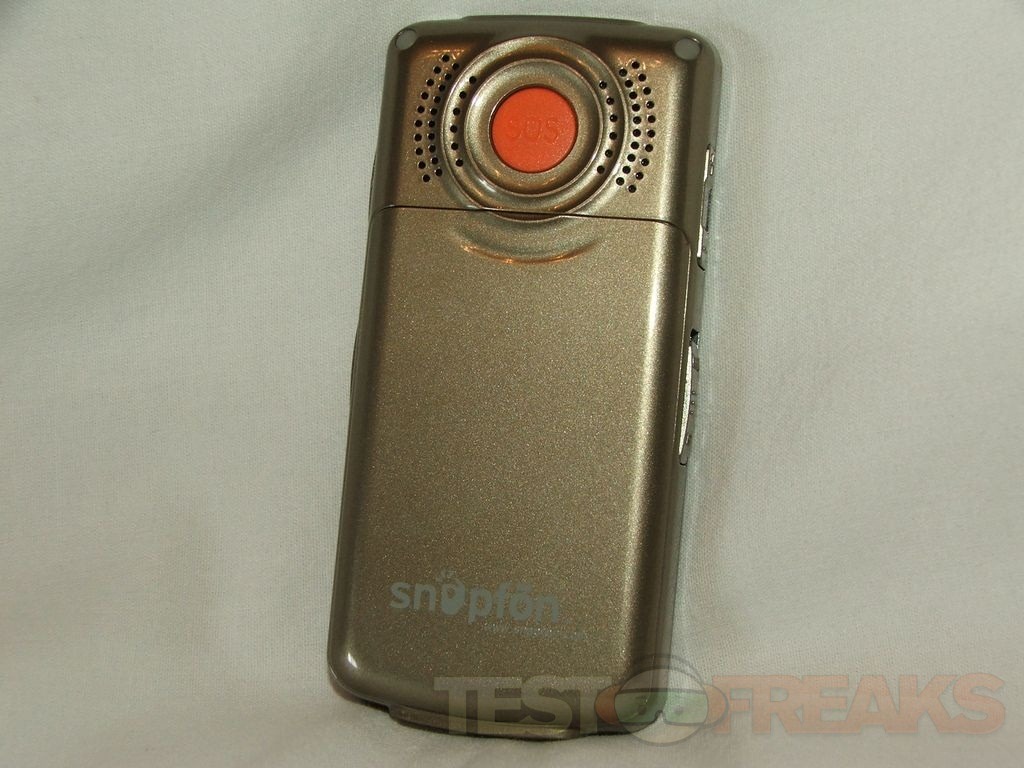 On the back you’ll see the speaker and an orange button that is recessed into the phone. The button is the emergency or S.O.S. button that you can program to call certain numbers.