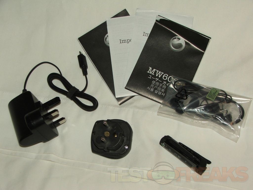 Despite the box being beat up the contents were fine. Inside you’ll find the MW600, a pair of headphones, documentation and a power adapter. Sadly they forgot I was in the US and sent me the UK power adapter, not a big deal though as I have adapters and you can also charge the MW600 with a regular micro-USB cable.