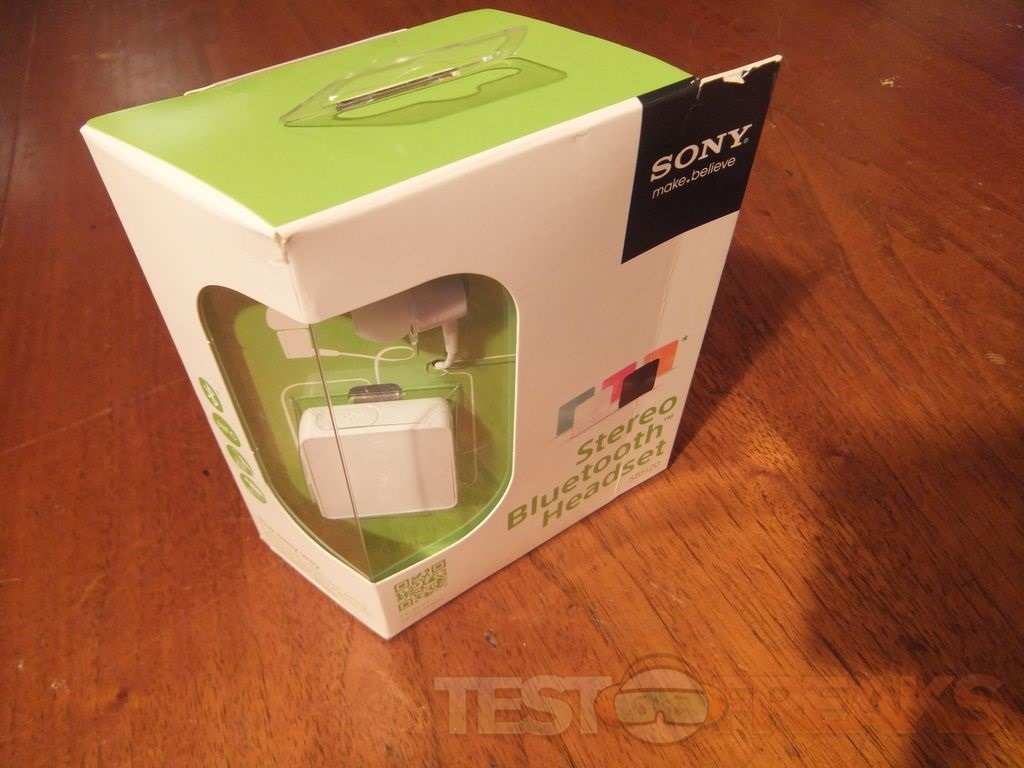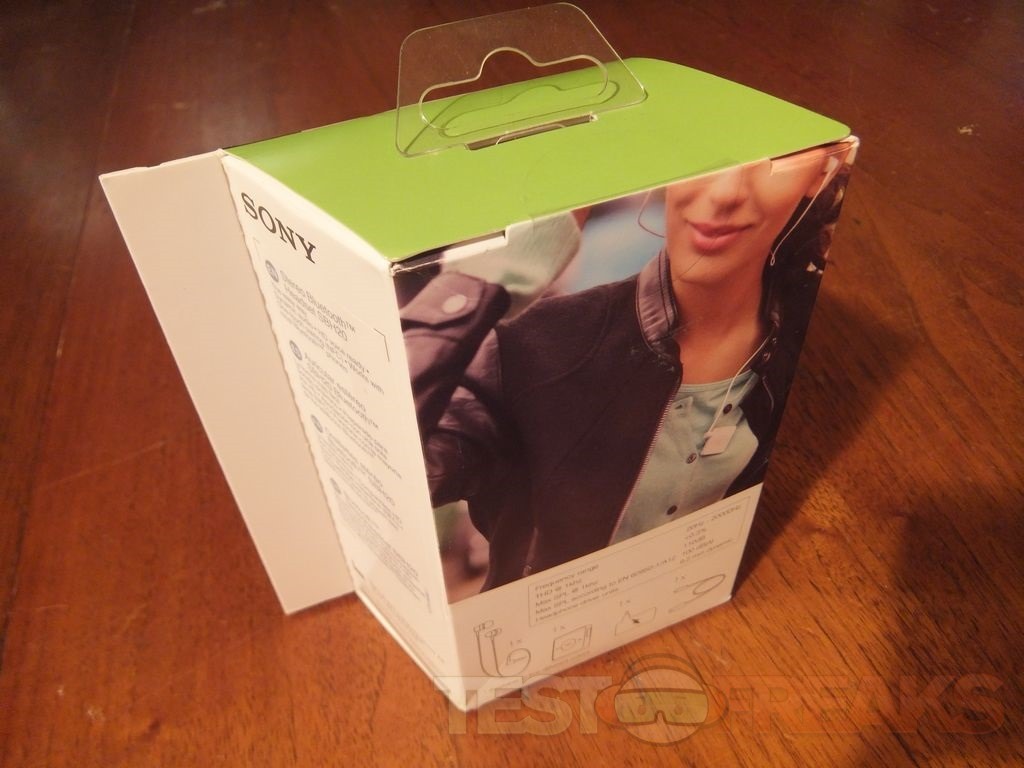 The Sony SBH 20 headset comes in an angle shaped box with a clear window showing the product and then some specs and features listed.
