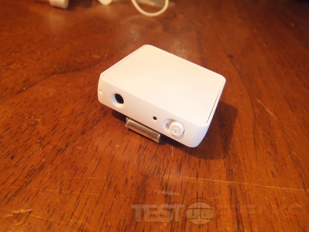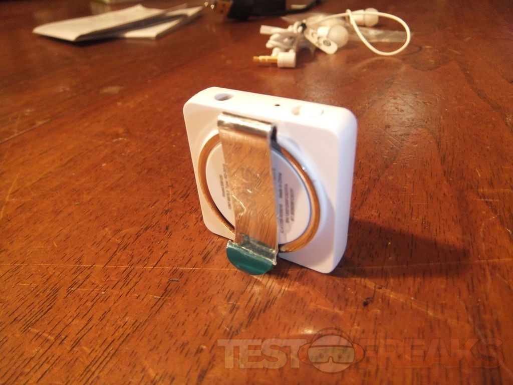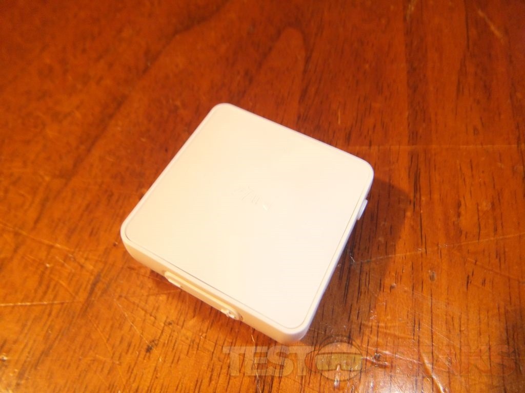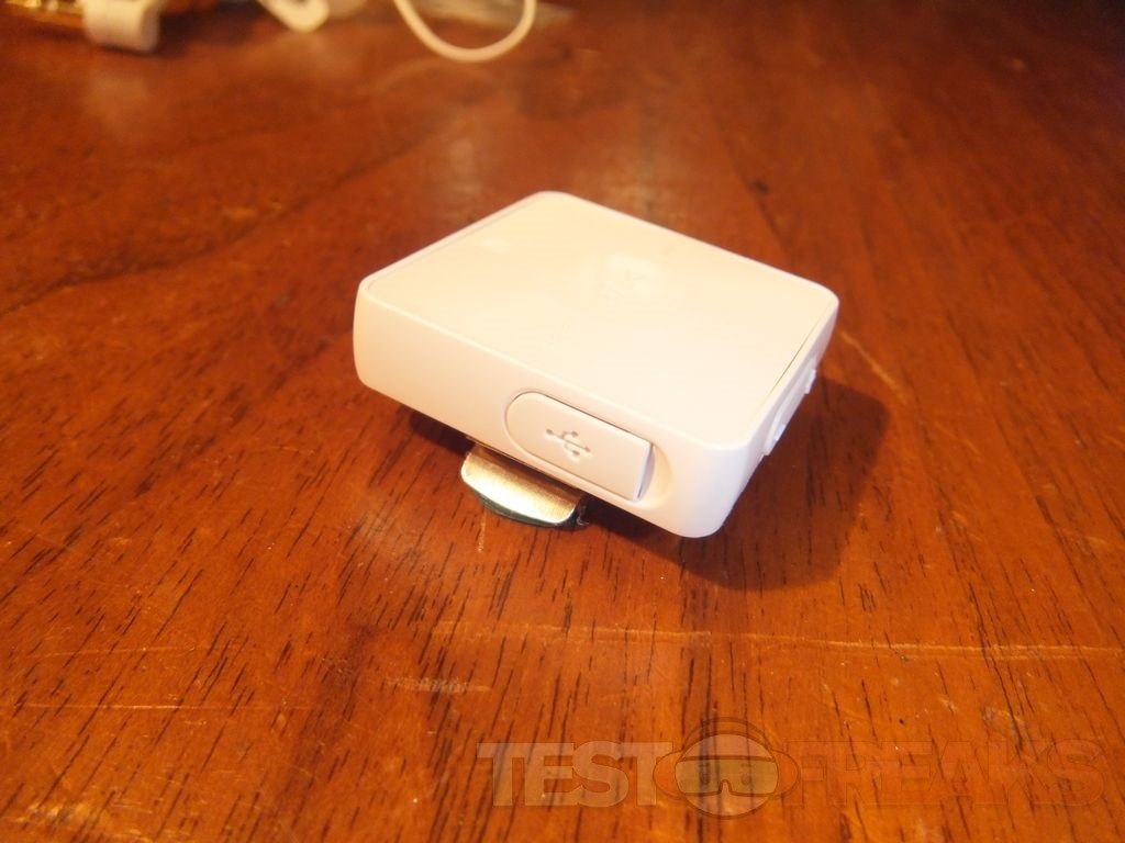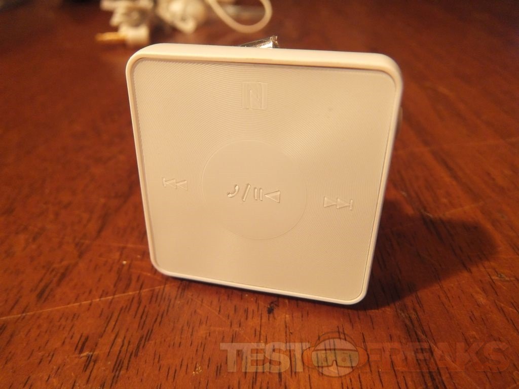 The SBH 20 main unit is a small white square measuring about 1.25” on each side and slightly more than .25” thick without the clip. I should note that you can get it in several colors, white, black, pink, orange and turquoise and the earbud covers match the color of the unit. The Sony site has listed measurements of 33.3 x 33.3 x 12.3 mm and it weighs in at 12.3 grams. In bright light the front of the SBH 20 unit looks plain, it just looks blank really.