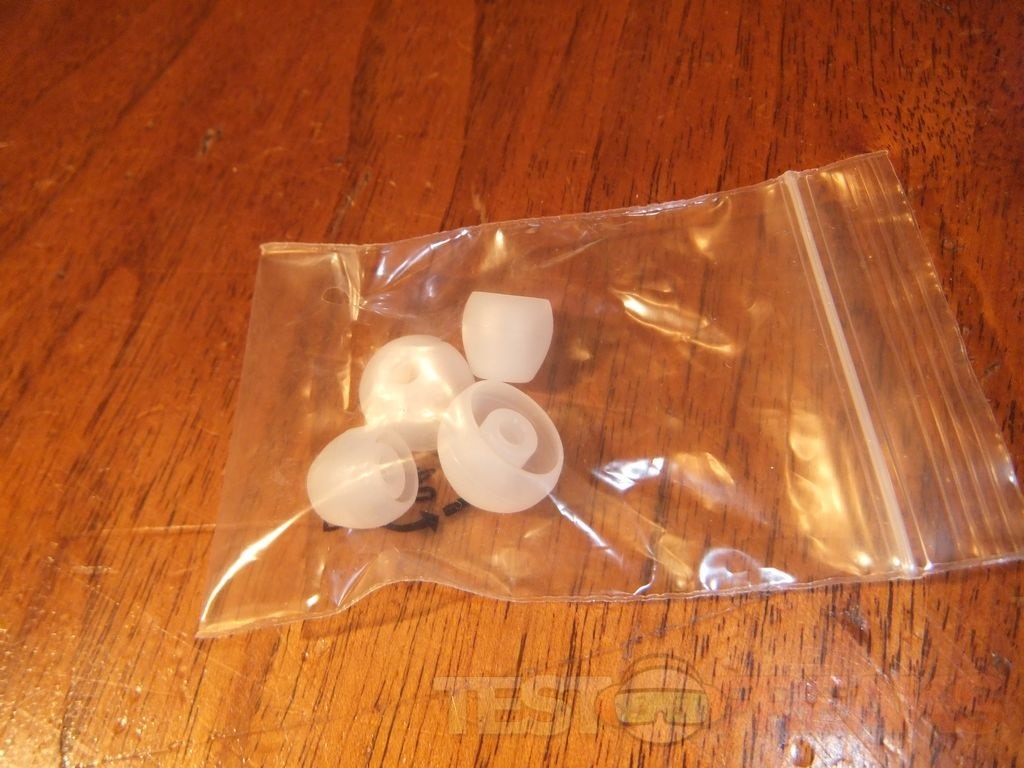 The headphones come with three different sizes of silicone earbud covers, one of which is already installed on the headset and the other two are in a separate bag.