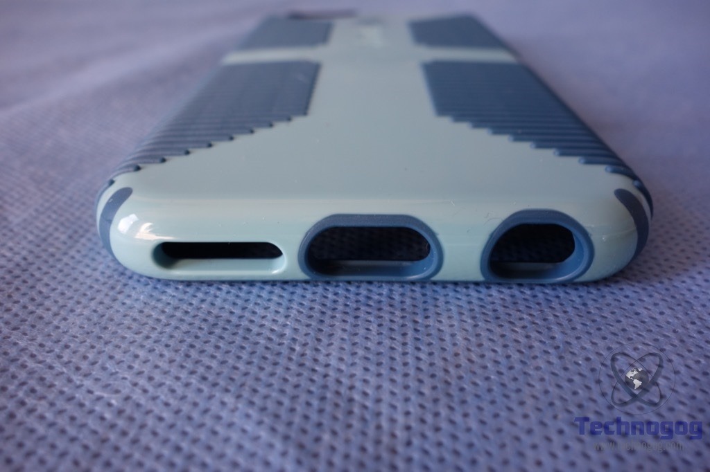 Rubberized buttons protect the power and volume switches. All of the iPhone’s remaining ports and switch are easily accessible with the case in place. The camera has a nice wide opening that does not affect the camera’s flash.