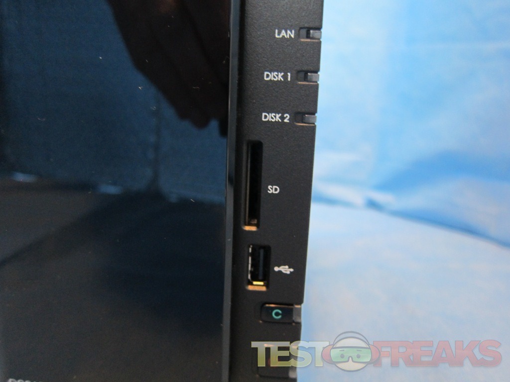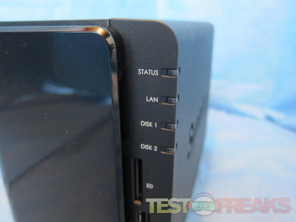This front panel has the model number on the bottom left. The right front has LEDs for Status, LAN, Disk 1 and Disk 2 along with an SD card slot, USB port, power and reset buttons.
