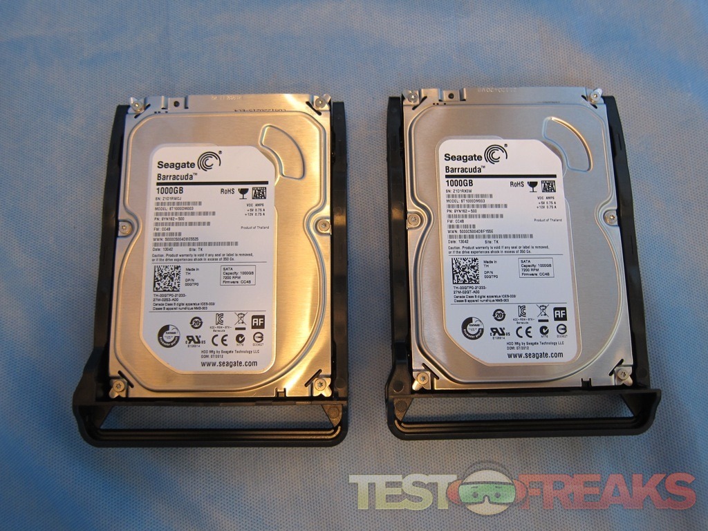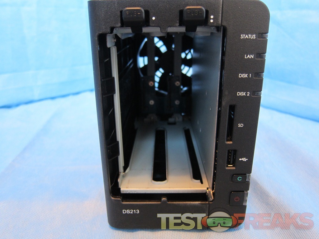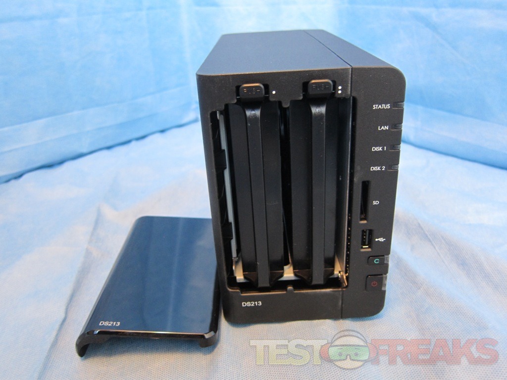 Removing the front panel reveals two drive bays that can accommodate either 3.5” or 2.5” hard drives; the drives are removed by simply pulling straight back on the tray handles. Synology shipped this review unit with two Seagate 1 TB Barracuda drives.