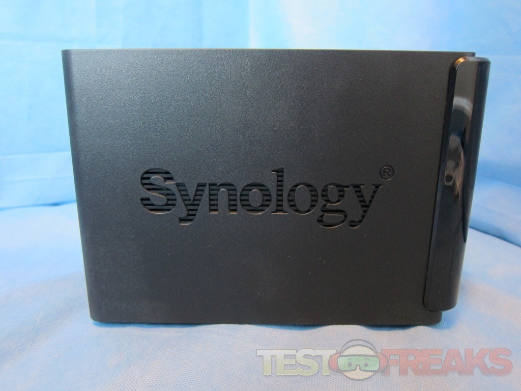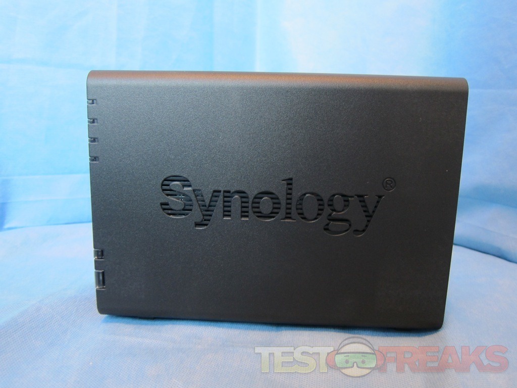 The side panels of the DS213 have the Synology name etched into the metal with an underlying mesh to provide airflow to the NAS.