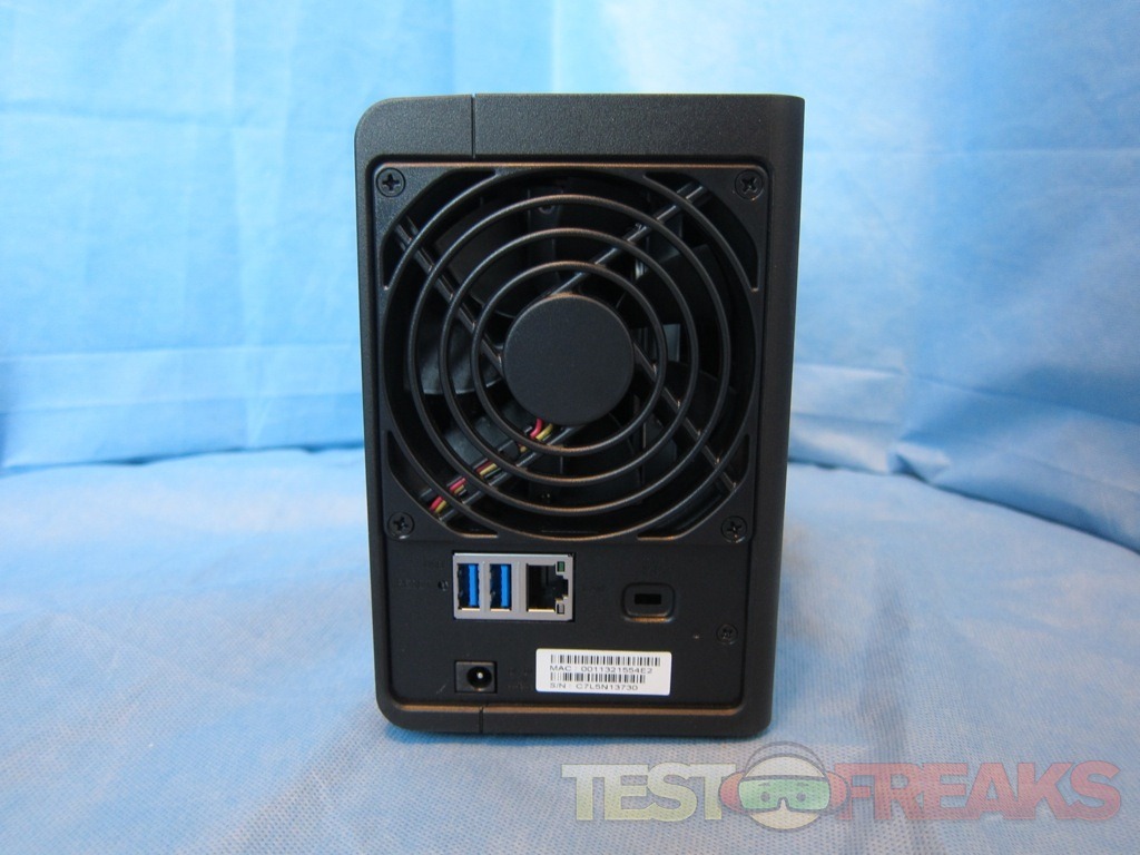 Looking at the back we see a 92 mm fan, two USB 3.0 ports, a Gigabit Ethernet ports, reset switch, a Kensington lock port and AC input. The fan has a noise level of 19.9 dB(A) to help keep the box cool and quiet. One of the ways this models differentiates from the DiskStation DS213+ is the lack of an eSATA on the back.