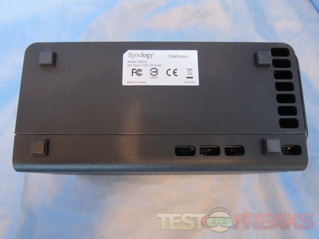 On the bottom of the Synology DiskStation DS213 are four rubber feet to keep the unit from sliding around.