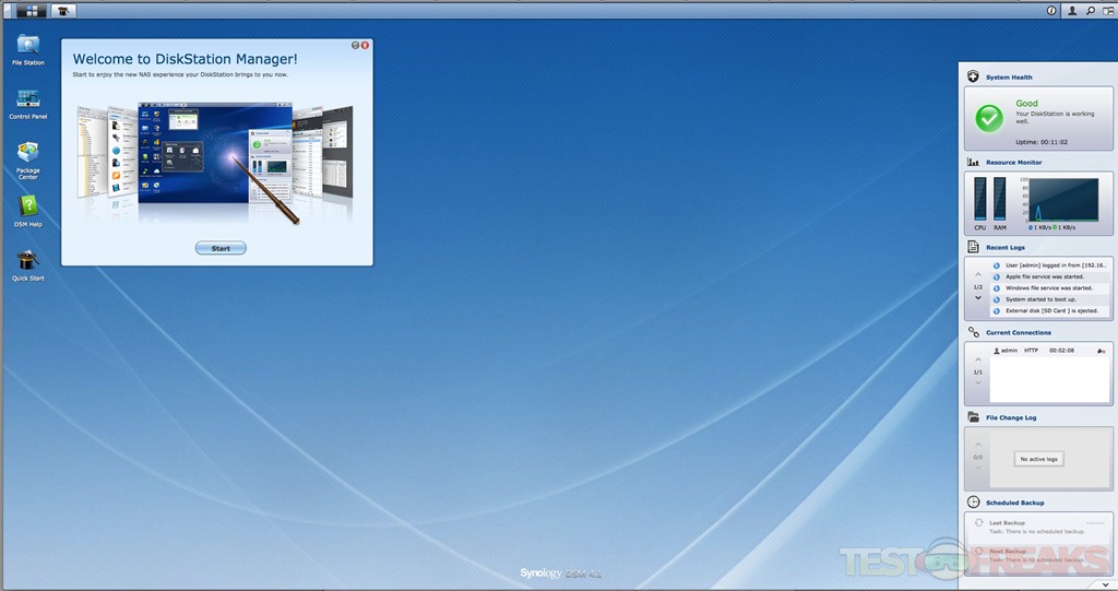 Once installed and everything is plugged in, install or download the Synology Assistant onto your PC or Mac. This program will identify the DiskStation on your network and open the DiskStation Manager (DSM) web interface. The DiskStation DS213 comes with DSM 4.1, the latest version preloaded.