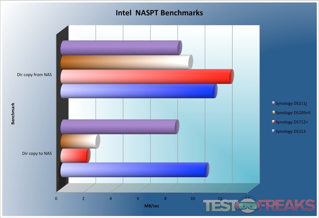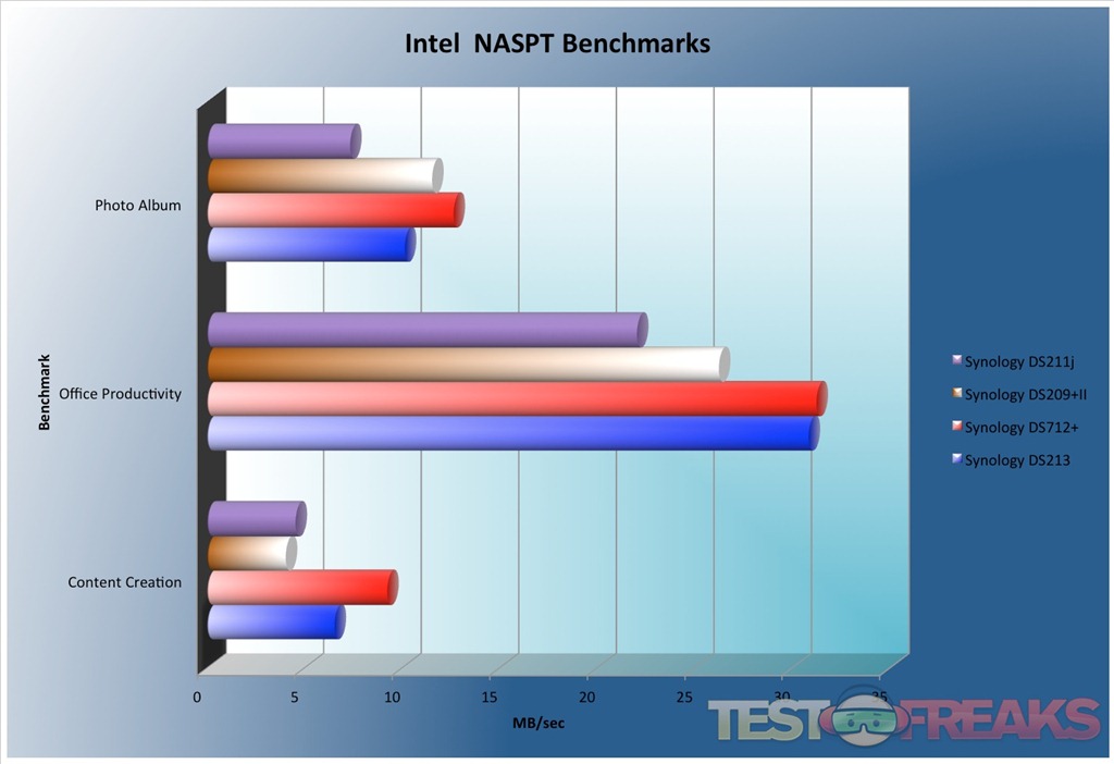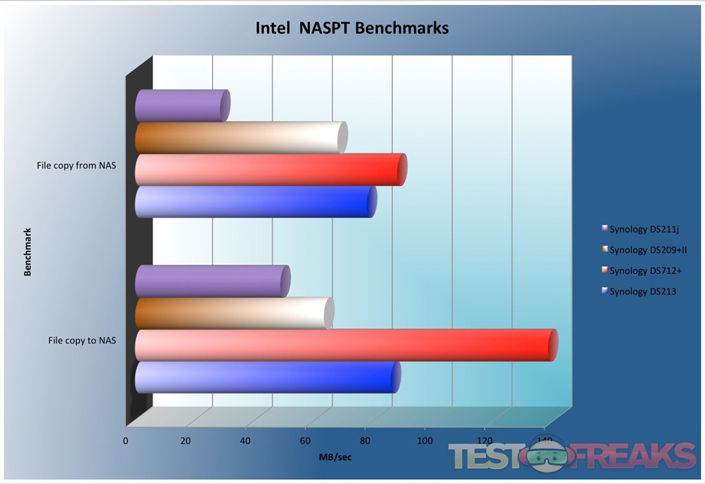 To test the DiskStation DS213 Intel NASPT (Intel NAS Performance Toolkit) was used for benchmarking. One caveat to testing with this utility is a system with more than 2 GB with Windows 7 64 bit may skew the tests with a recommendation to use Windows XP 32 bit with 2 GB of RAM. However since the test platform is the same for all NASes being benchmarked, it should provide a relative comparison.