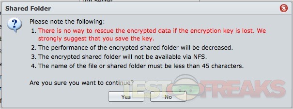 Encrypted shared folders using share-level AES 256-bit encryption. The one drawback to using this encryption is the transfer speed decreases by four fold. Transfer speeds dipped into the teen and twenty Gb/sec range using encryption. Security is a plus but it will slow down the network transfer speeds.