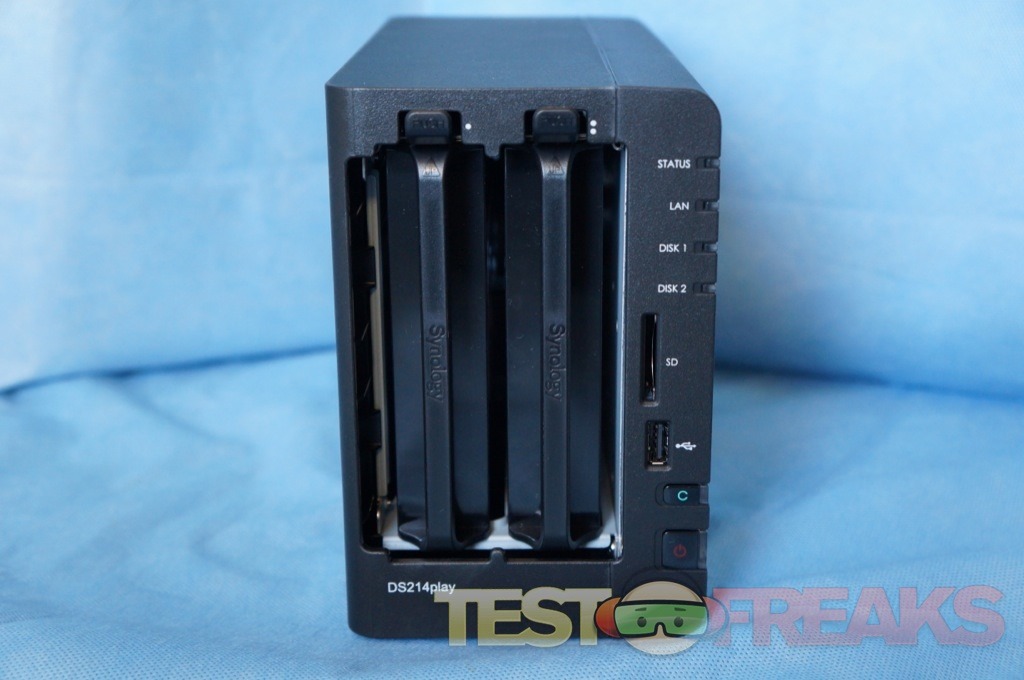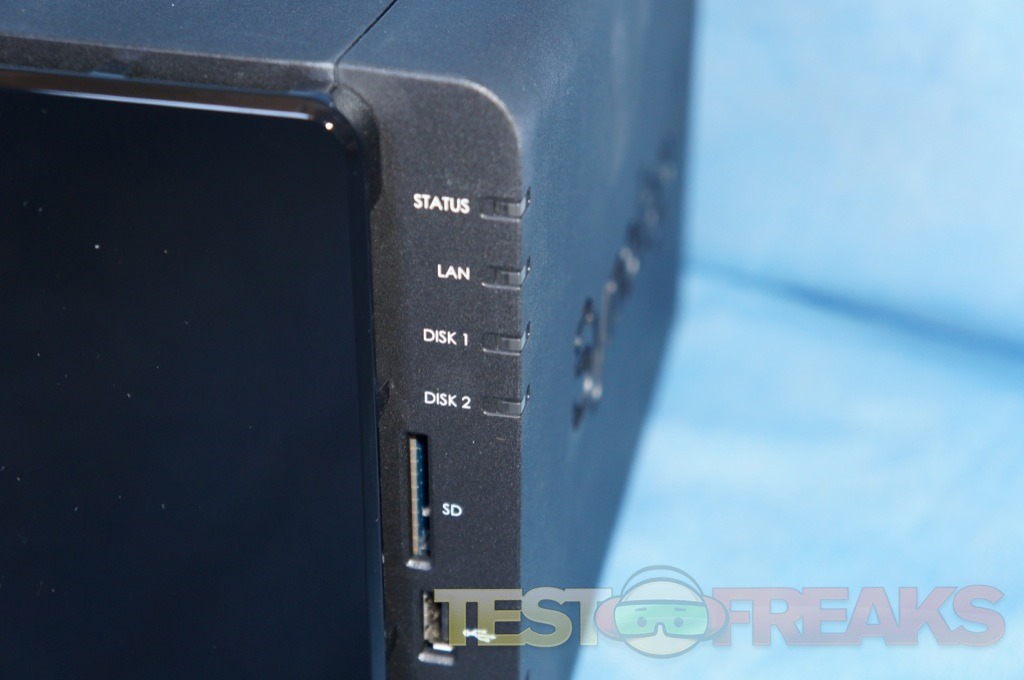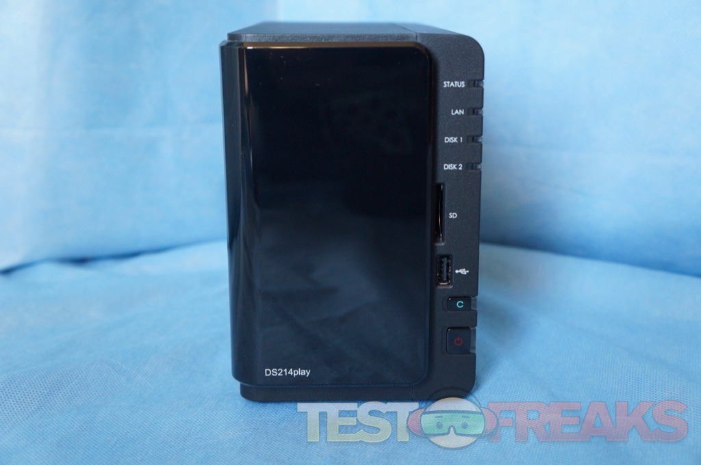 On the face of the DS214play are four LEDs on the right side for Status, LAN, Disk 1 and Disk 2. An opening for an SD card reader is found below these lights with a USB 2.0 port beneath it. Located on the bottom right are copy and power buttons along with additional LED lights.