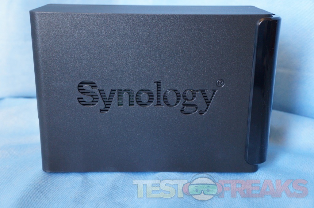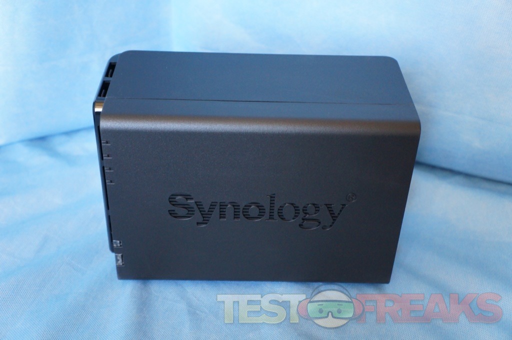 Like prior versions on the sides of the NAS is the Synology logo with ventilation grates behind the lettering.