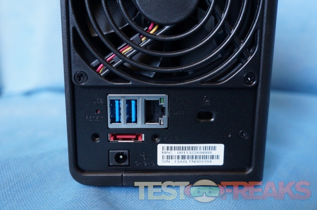 At the back of the unit we find a 92mm system fan with two USB 3.0 ports, a Gigabit Ethernet input, eSATA port along with a Kingston lock slot and of course the AC connector. Strangely missing from a device marketed for media streaming is an HDMI port, which would allow the device connect directly to a television.