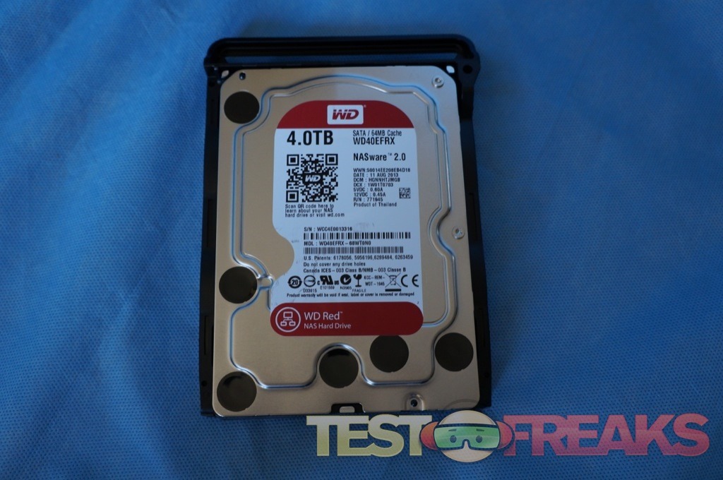 Removing the plastic drive cover reveals the drive bays designed to work with either 2.5” or 3.5″ drives. The slide out drive trays are released by pushing the top tab. These sleds are tool-less meaning swapping drives can be done in less than a minute. The maximum internal capacity for this unit is 8 TB when using two 4 TB hard drives. For our review we tested the DiskStation DS214play using two Western Digital RED 4 TB drives that were provided with the test unit.