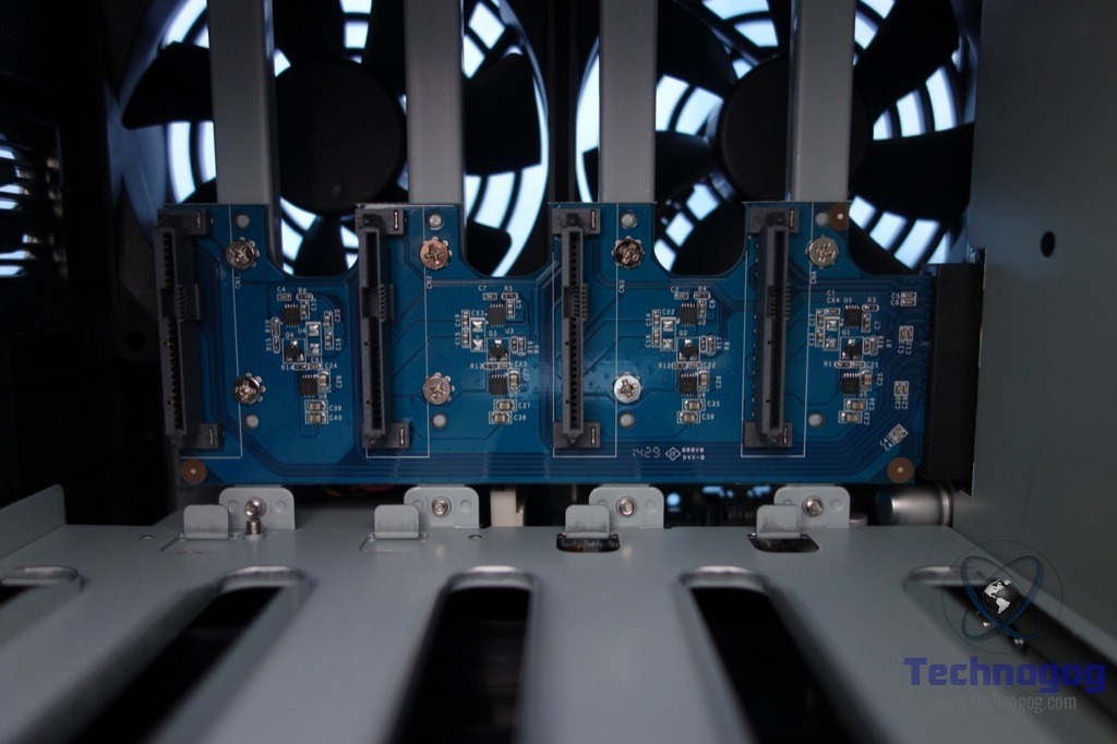Once again Synology employs the screwless drive trays. These bays can accommodate either 3.5” or 2.5” hard drives as well as 2.5“ SSDs. Pressing the top tab pops out the trays allowing quick installation or replacement of drives.