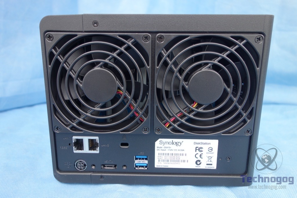 Looking at the rear of the DS415+ we find two 92 mm fans, one for each pair of drives. Beneath these fans are two USB 3.0 ports, two Gigabit Ethernet jacks, eSATA port along with a Kensington lock slot and of course the AC connector.