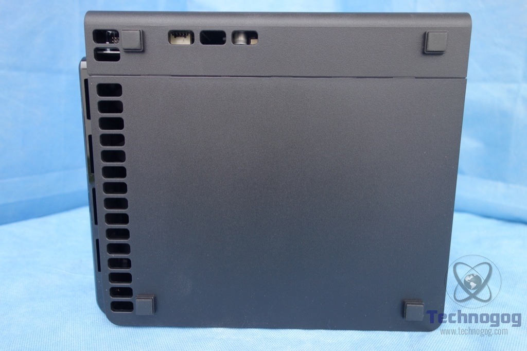 The chassis is composed of a matte black plastic with a textured feel. On the front of the unit is a piano black plastic shield with the model number on the bottom left corner. This shield covers the hard drive racks and is kept in place with rubber feet.