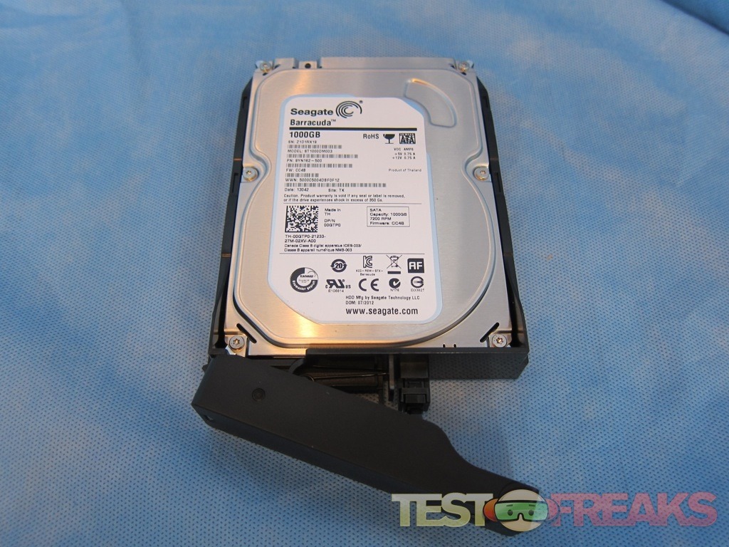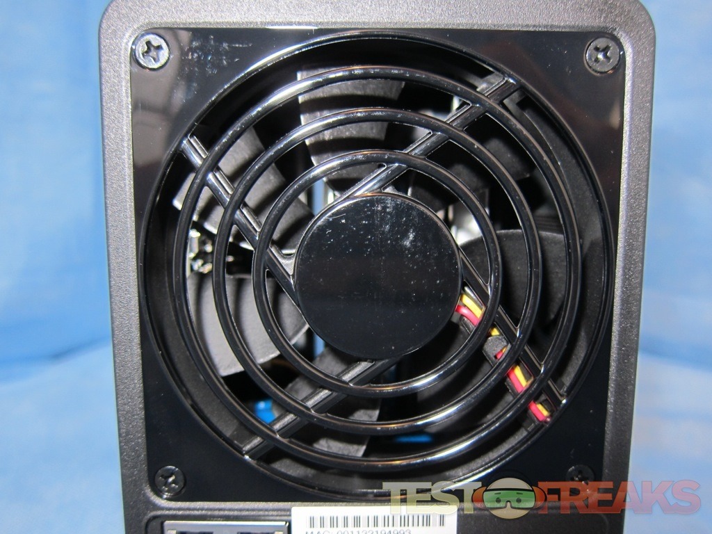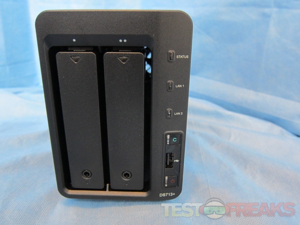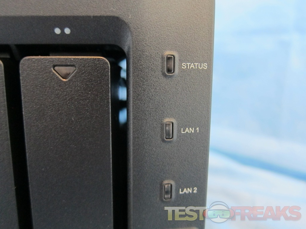 Our review box came preinstalled with two Seagate Barracuda 7200 RPM models. Adjacent to the right side drive are LEDS for Status, LAN1, LAN2, along with a USB Copy button, USB port and Power button.