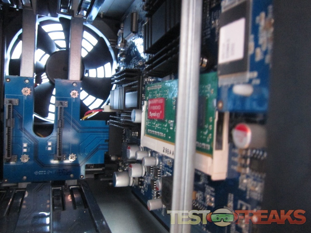 Here is a look at the inside of the Synology DS713+ without the drives in place where you can see the motherboard and a single laptop size stick of 1 GB DDR3. According to some online research the 1GB DDR3 memory module can be upgraded to a 2GB stick such as the Kingston KVR1066D3S8S7/2G.