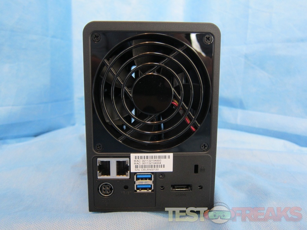 On the back of the Synology DS713+ we find a 92mm fan with a noise level of 19.2 dB (A), dual Gigabit Ethernet ports, eSata port, reset switch, a Kensington lock port and an AC input. The newest additions to this back panel are two USB 3.0 ports. Now you can take advantage if the faster USB spec when attaching additional storage to the NAS.