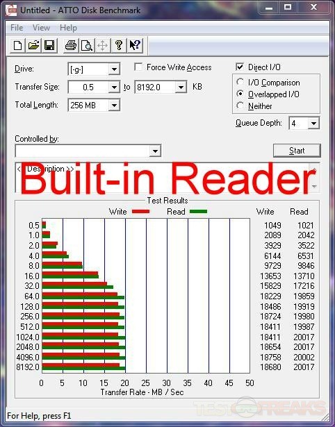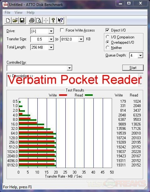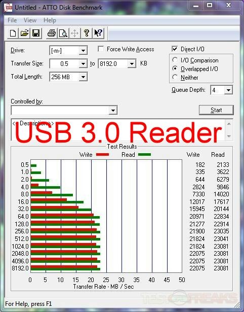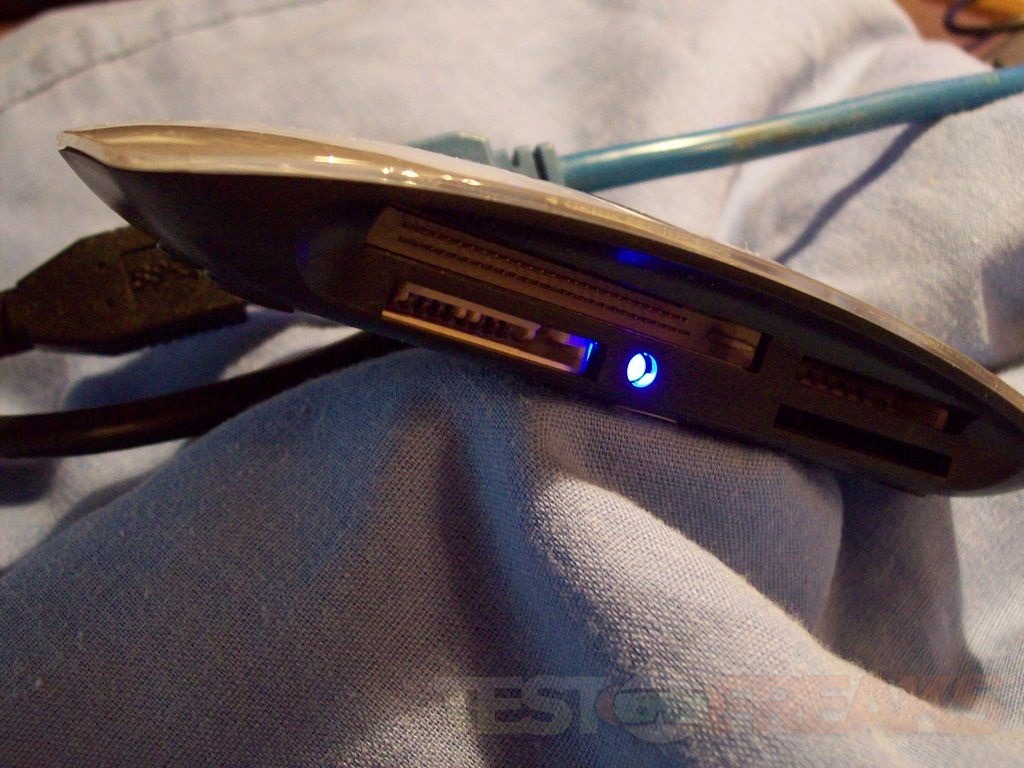 The LED on the card reader is blue and it blinks for activity. For testing I used the same ATP 4gb SDHC Class 6 Card and am comparing it to the built-in USB 2.0 card reader in my computer and to the Verbatim USB 2.0 Pocket Card Reader. So I’ve got ATTO Disk benchmark test results for you. So the USB 3.0 is faster as you can see, the write speed is about 4 mb/s faster and the read is about 3 mb/s. It’s not amazingly fast, but there is an improvement. There might be more of an improvement if I had a faster card, but I don’t seem to have any on hand.