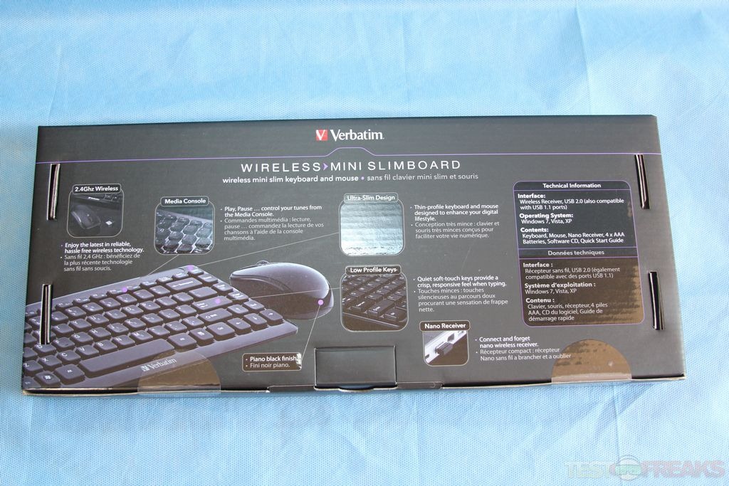 The Verbatim Mini Wireless SlimBoard comes packaged in a black cardboard box with a clear window in the center showing off the keyboard. On the back are additional images of the keyboard and mouse along with specific features of the Mini Wireless SlimBoard; in addition there is a listing of technical specs. Inside the package we find the keyboard, mouse, Nano receiver, four AAA batteries, Software CD, and Quick Start Guide.