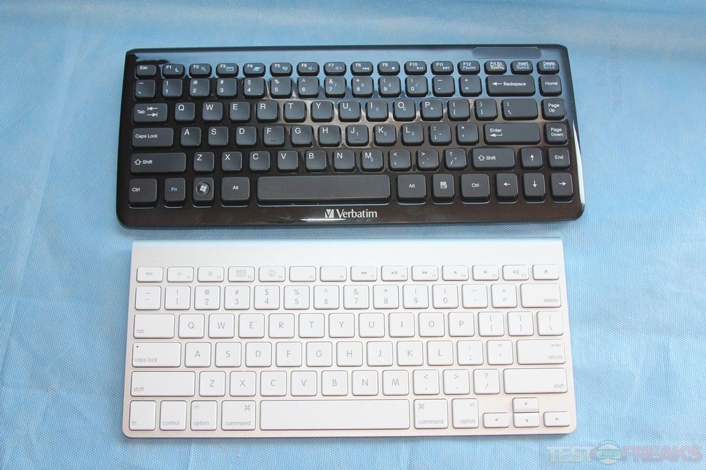 The keyboard arrangement uses a laptop arrangement instead of a desktop format. The function keys at the top also double for media controls and to launch e-mail or the web browser. Below the space bar is the Verbatim logo.