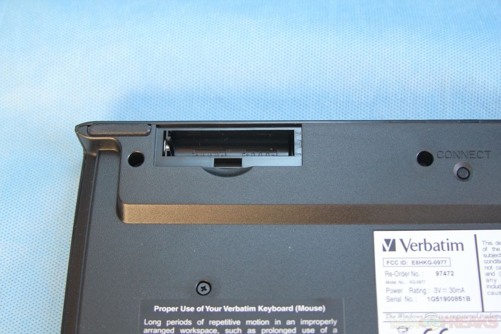 Underneath the keyboard we find an opening for two AA batteries and a connect button for syncing the keyboard and mouse to one another. For those who like their keyboard on an incline we do not find any standoffs or feet to change the typing angle. Rubber grips on the bottom help keep the keyboard from sliding around.