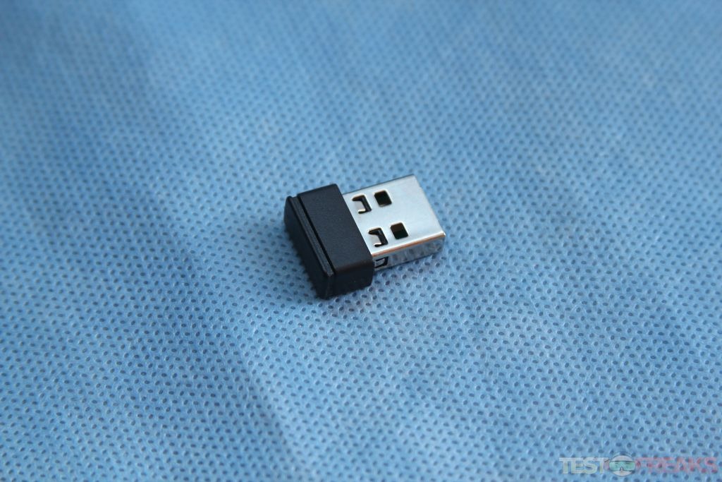 Opening the battery door reveals the Nano receiver which is stored here when the mouse and keyboard are being transported or not in use for long periods of time. The mouse also takes two AAA batteries.