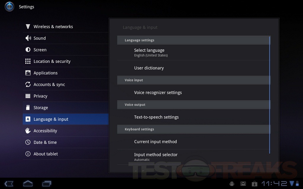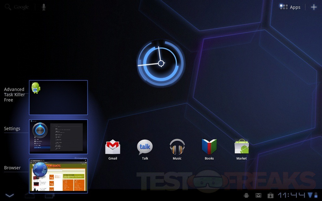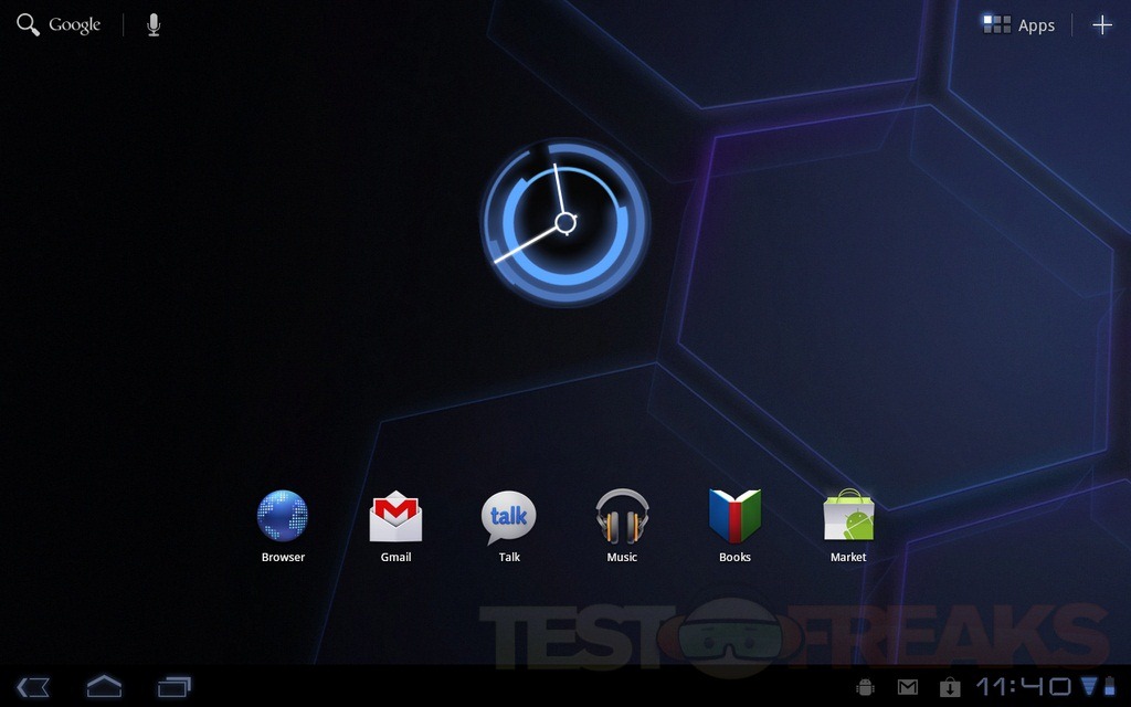 My phone uses Android 2.2, and going to Honeycomb is a big difference really. When you first turn it on you’re greeted with a nice looking clock and a few icons for Browser, Gmail, Talk, Music, eBook and Market. At the top right corner you’ll see a shortcut for App and a ‘+’ to add more things to the screen. Over at the top left corner is Google search and microphone. At the bottom left corner you’ll find shortcuts for Home, Back and Task manager or running programs, then at the bottom right corner is the time and other status indicators.