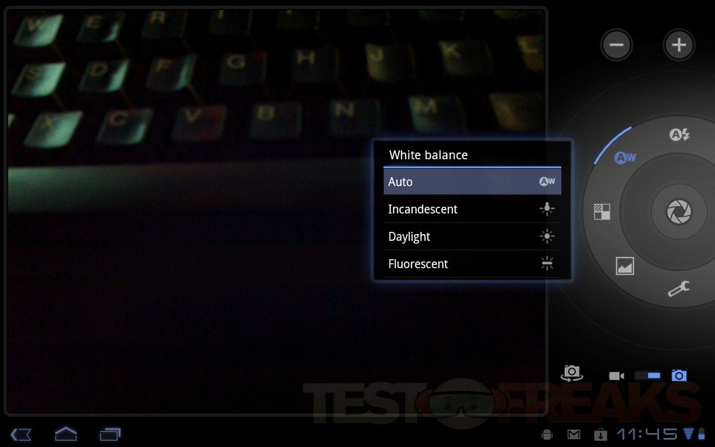 The camera is rather nice, it’s 5mp and can do 720p video and it actually has quite a few settings for you to adjust to get the best pictures you can get. The interface is easy to use, plus and minus buttons at the top for zoom, the a wheel like interface for all of the settings, everything is right there at you fingertips for quick and easy access. At the bottom is a little camera button that you can tap to switch between the front and back cameras, and a slider next to that to switch between still and video.