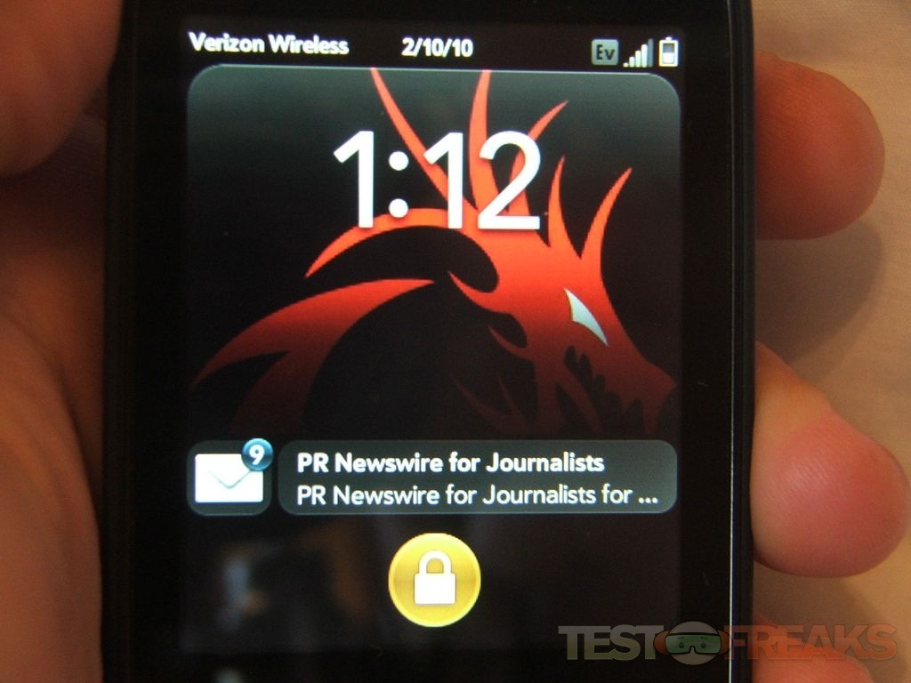 To wake the phone you just hit the power button and the interface lights up for you, you can do the same to lock the phone as well. To unlock the phone you’ll slide the little lock icon, when it’s locked though you’ll see your newest email message there for you.