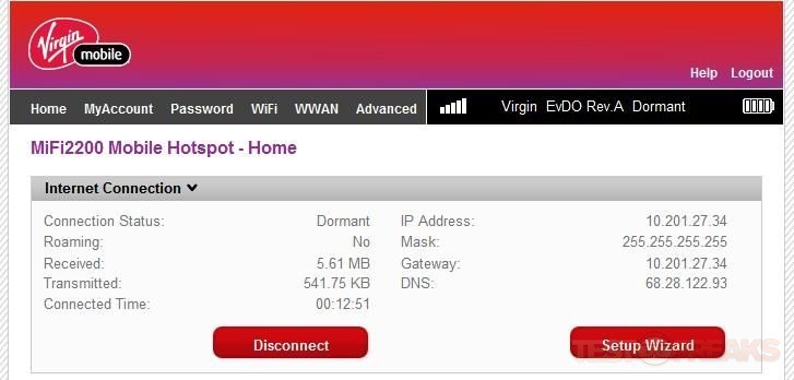 To access your MiFi you’ll need to go to virginmobile.mifi to open up the interface for it. On the main page you’ll find connection status with a bit of information like connection status, data transferred and received and the time connected along with IP info.