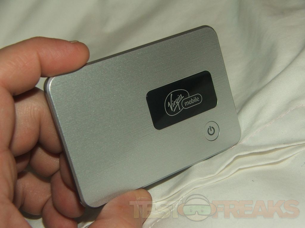 The MiFi is small weighing only 2.08oz and with dimensions of 3.5” x 2.32” x .35”. The top is fancy looking silver color with a brushed pattern on it, there’s a power button on the top.