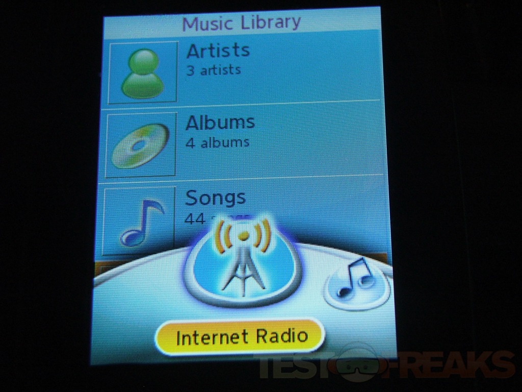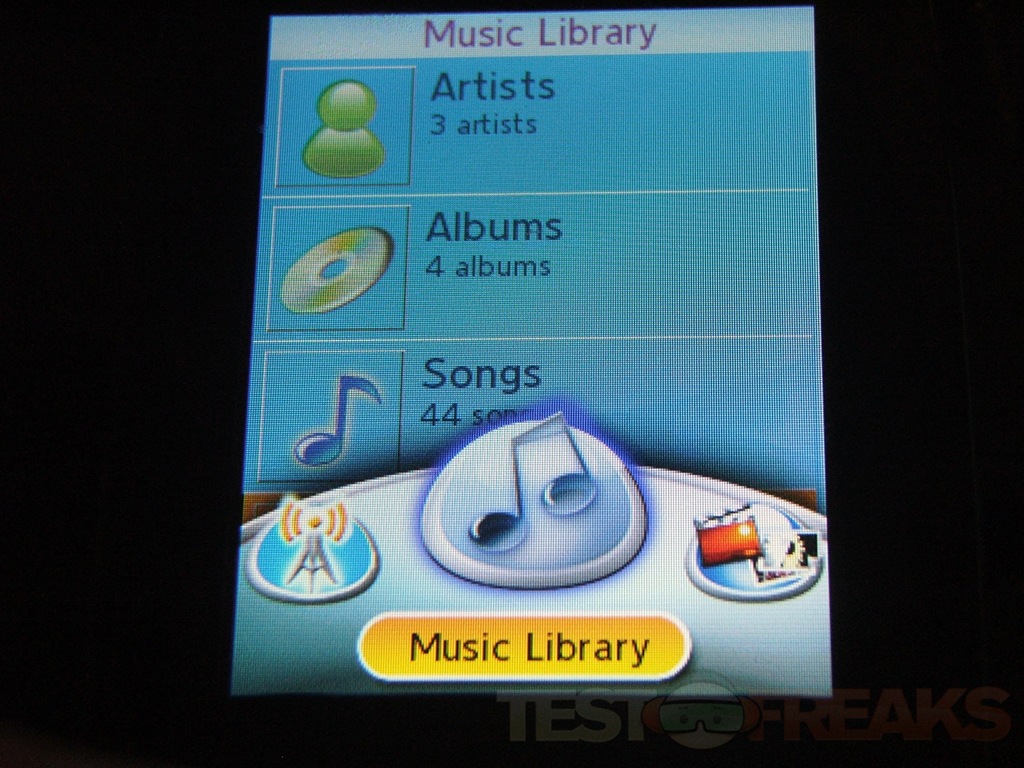 The interface is colorful and the graphics are nice actually. The navigation menu is on the bottom and you scroll through them to select where you want to go. The basics are Music Library, Settings and Pictures and Videos.