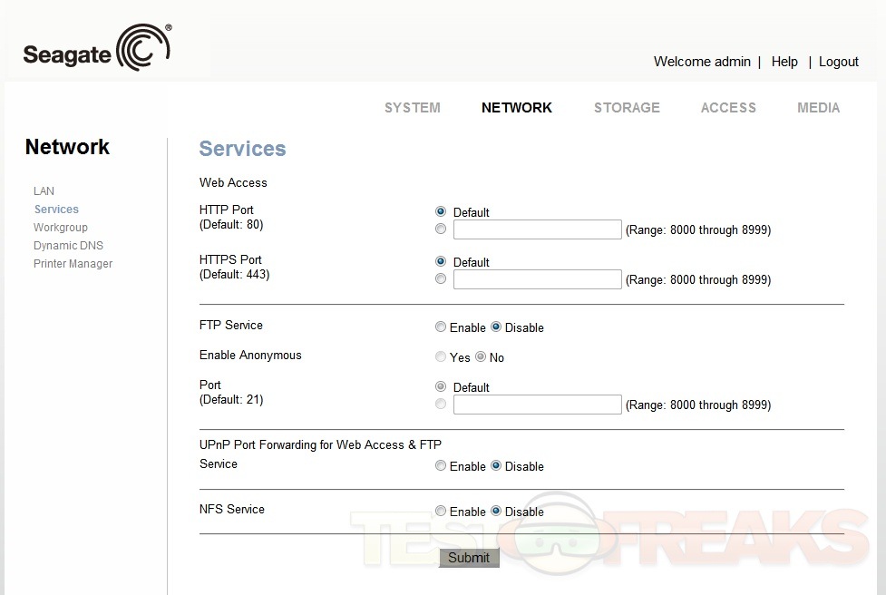 Under the Network Tab you can setup your services like FTP, HTTP Access, UPnP and NFS along with Workgroup names, Dynamic DNS Management and and Network Printers.