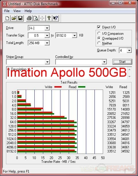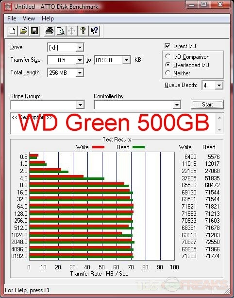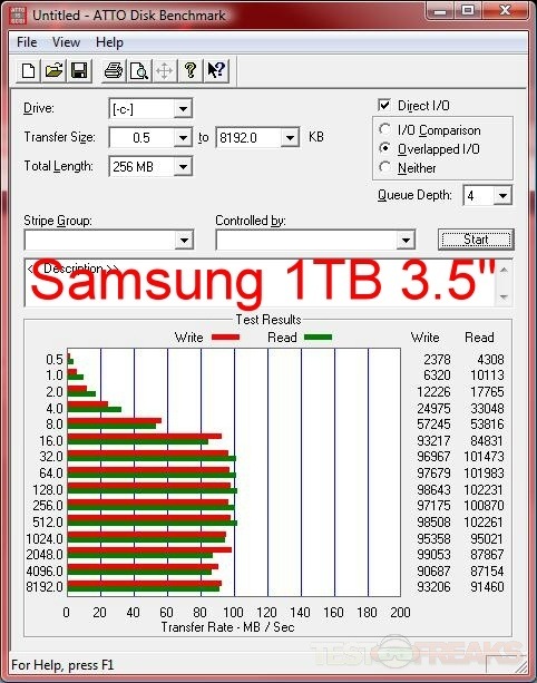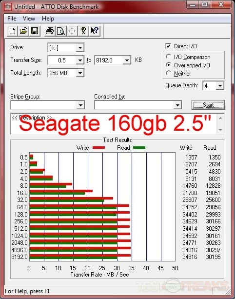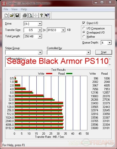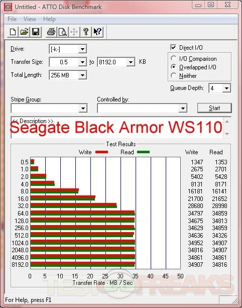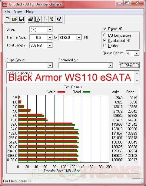 Here’s the results for testing with ATTO, I’ve got a few drives included for comparison, and I’ve included results for both eSATA and USB interfaces of the BlackArmor WS 110.