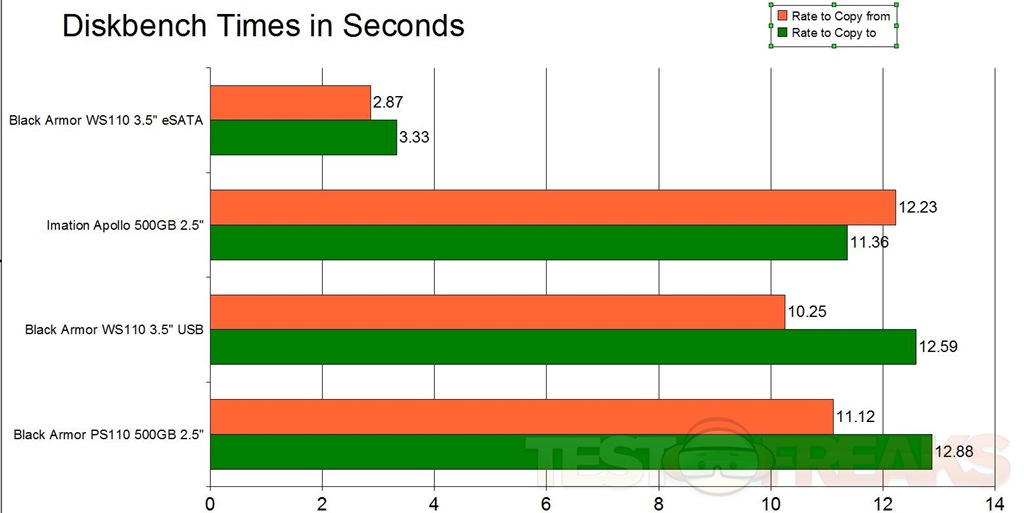 Next up is testing with Diskbench and the time it takes to Copy to and Copy from the external drives I’ve got on hand. I used a 350MB .AVI Video file for the testing. Lower time is better of course.