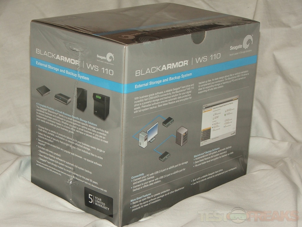A few days ago I took a look at the Seagate BlackArmor PS 110 2.5″ external hard drive, today I’ve got the BlackArmor WS 110. This drive utilizes a 3.5″ 1TB hard drive inside of the unit, and features both eSATA and USB connections along with everything that the PS 110 can do. So let’s just jump right in…