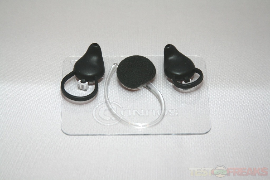 The USB cable has a micro-USB connection on one side and the standard USB connection at the other. Plugging the standard USB connection end into the AC adapter allows the headset to be charged from an outlet. Sound ID provides additional ear loops to accommodate smaller and larger ear canal openings. The medium ear loop comes preinstalled on the Sound ID 400. There is also an over the ear style, which can be used with a foam cushion if so, desired.